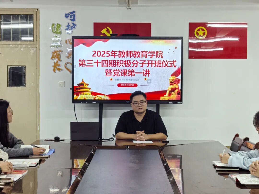 (通讯员 程雨彤)教师教育学院于10月14日晚在“逐梦空间”一站式社区召开了第三十四期入党积极分子开班典礼暨党课第一讲。学生党支部书记王许达主讲。