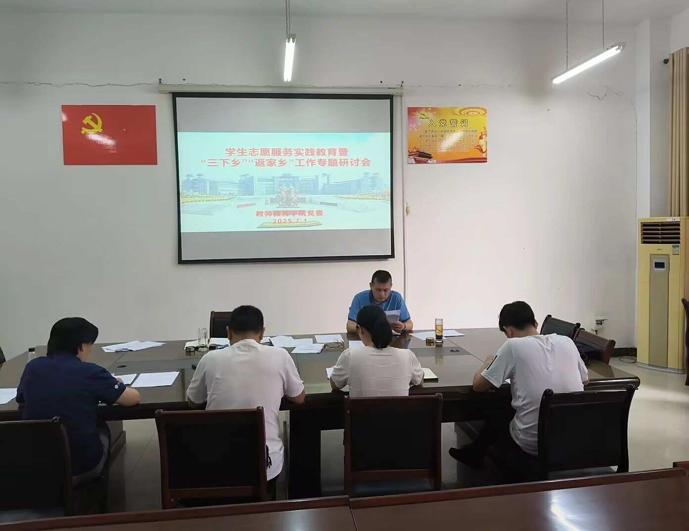 (通讯员 程雨彤)2025年7月1日下午,教师教育学院在N8-A106会议室召开党政联席会,开展了学生志愿服务实践教育暨“三下乡”“返家乡”、“逐梦空间”一站式比学生社区建设、心理健康教育工作暨心理工作站建设、五个校园建设工作、学生党建工作、学生思想政治教育工作、教师教育学院意识形态领域安全和学生安全工作、学生社团工作等多项学生工作专题研讨会。会议由党委副书记张辉主持,学院全体领导班子参会。