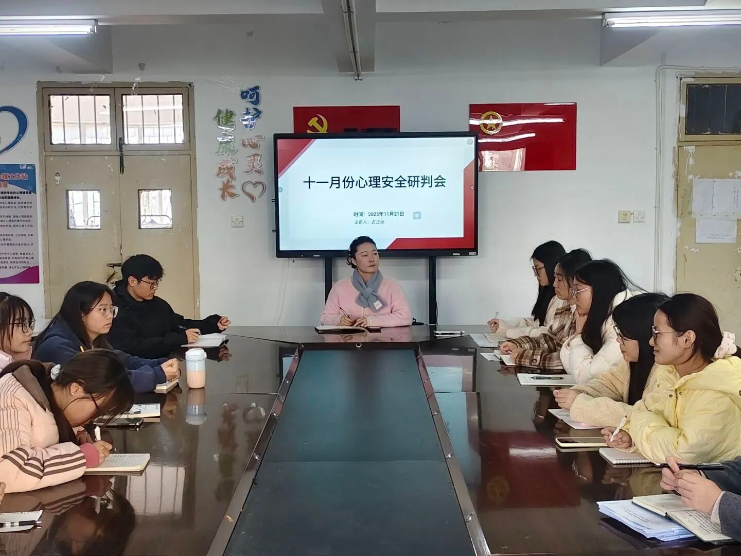 (通讯员 程雨彤)为全面掌握学生心理动态,有效防范因角色认知偏差、沟通方式不当引发的心理风险,11月21日中午,教师教育学院分团委书记、心理辅导员占正丽在十六栋二楼“逐梦空间”心理工作站召开了十一月心理安全研判会。学院各班班长、心理委员以及心健部全体成员参与会议。