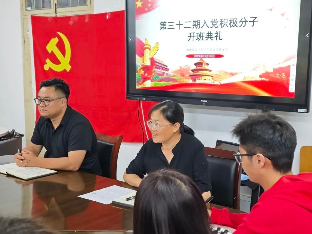 (通讯员 王许达、聂姜玲)为深入推进“一站式”学生社区综合管理模式建设,深化“三全育人”综合改革,充分发挥党员先锋模范作用和16栋功能性学生党支部的战斗堡垒作用,加强对“一站式”社区党员进行教育、管理、监督和服务,提高党员素质,增强党性,严格党的组织生活,增强学生党员的组织观念和纪律意识,教师教育学院于2024年10月10日晚在“逐梦空间”一站式社区召开了第三十二期入党积极分子开班典礼。本次开班仪式由教师教育学院学生党支部联席会组织部部长韩敬敬主持。出席本次开班仪式的有教师教育学院党委副书记张辉、学生党支部书记王许达、学生党支部联席会副书记汪景一、刘湘杰,以及全体第三十二期入党积极分子。